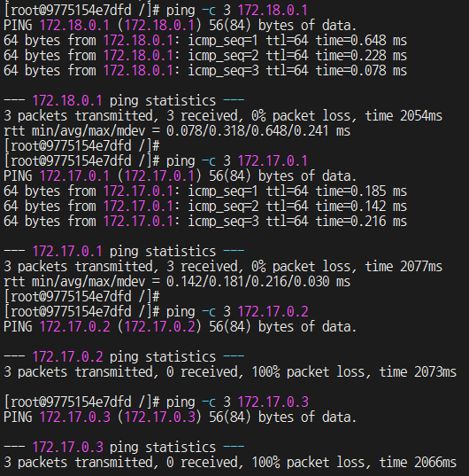 > ping 테스트의 경우 마찬가지로 본인은 가능하지만 서로 간의 통신을 불가하다