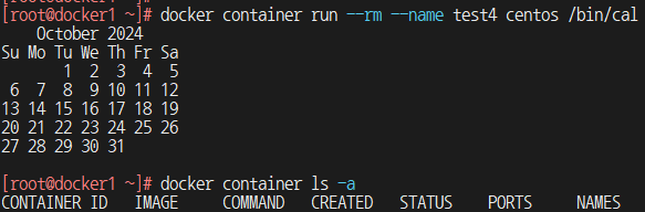 # docker container run --rm --name "test4" centos /bin/cal