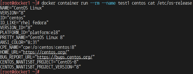 # docker container run -it --name test2 centos /bin/bash