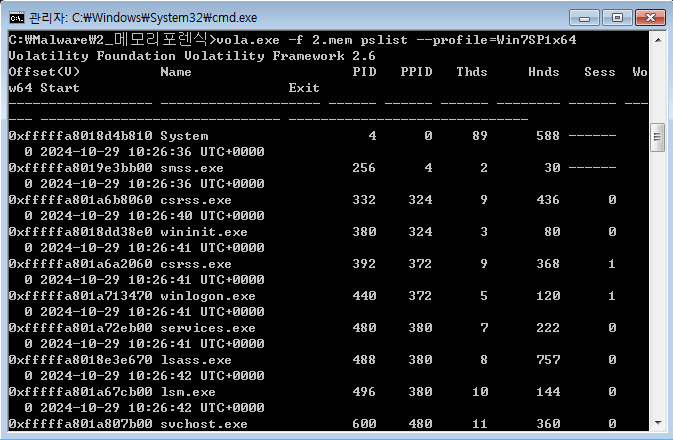 두 번째의 파일을 생성하여 2.raw로 pslist를 확인한다