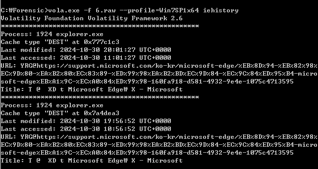 6.raw 파일로 iehistory를 이용하여 사용 기록 목록을 출력했으며,
