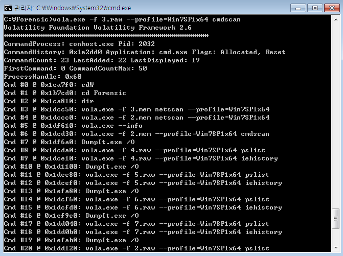 c:\ vola.exe -f 2.mem --profile=Win7SP1x64 cmdscan
