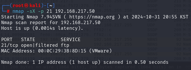 이 명령어는 IP 주소 192.168.217.50의 포트 21에 대해 ACK 스캔을 수행하여