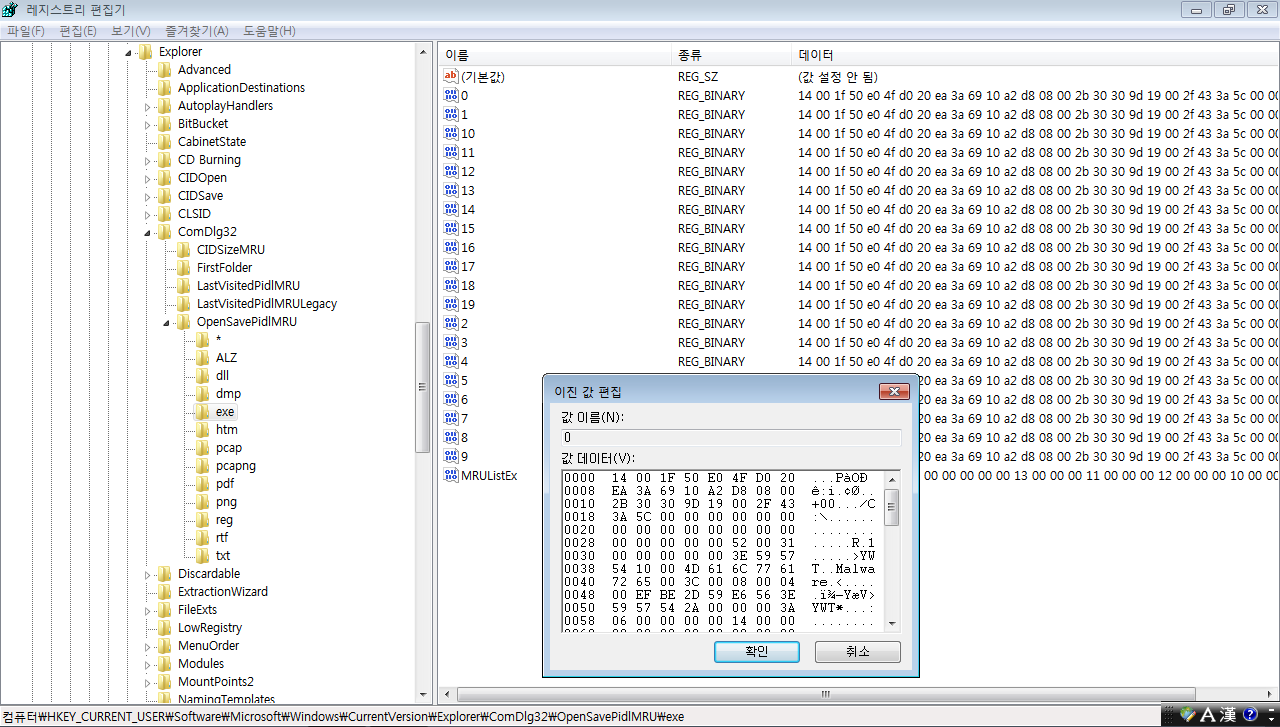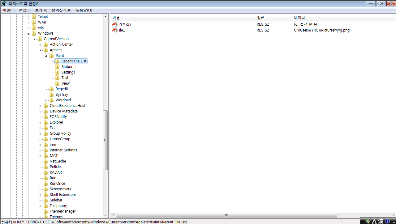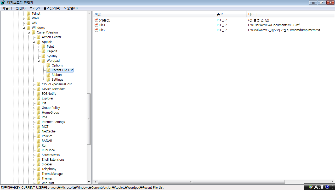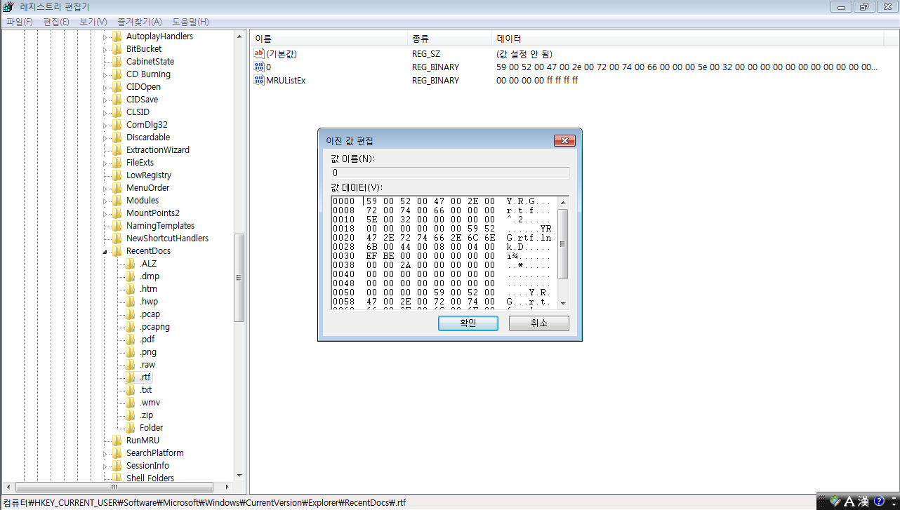 한글을 사용했다면 사용 흔적이 나타나게 된다