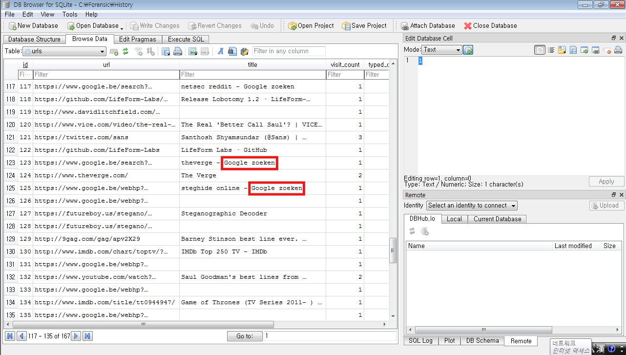 이번에는 추출한 History를 SQLite DB Brower 프로그램으로 실행 후 열었다