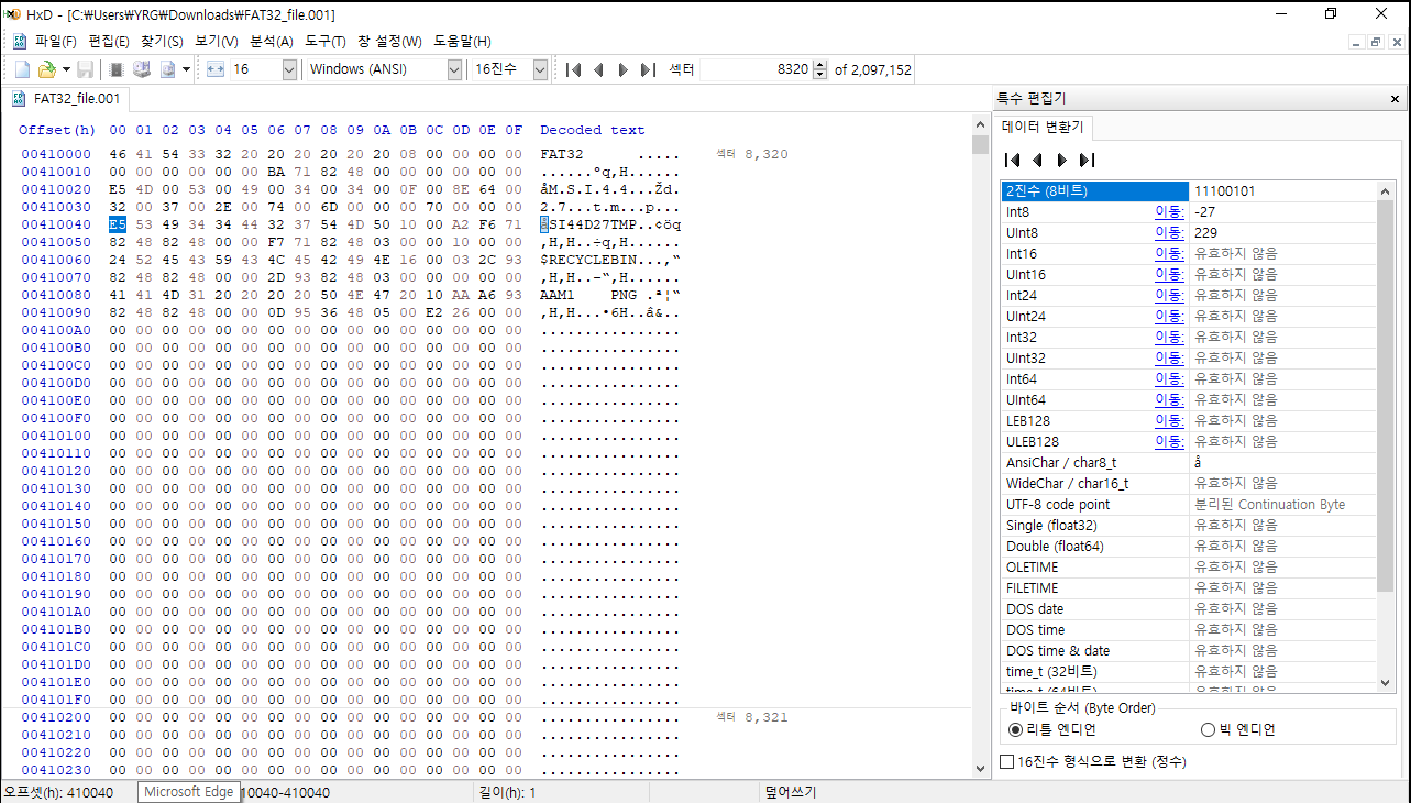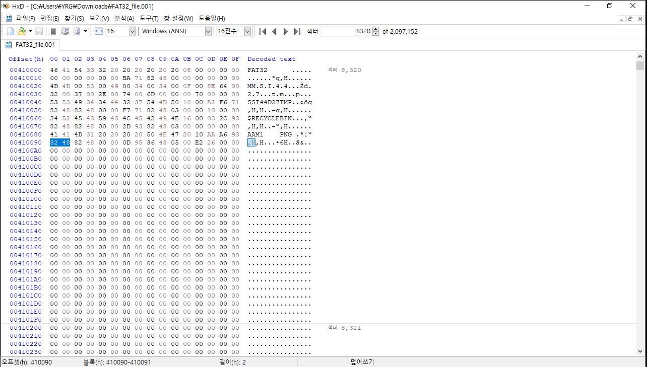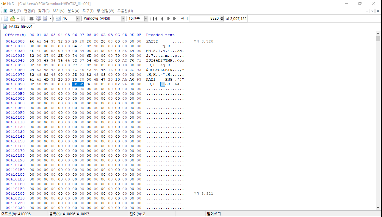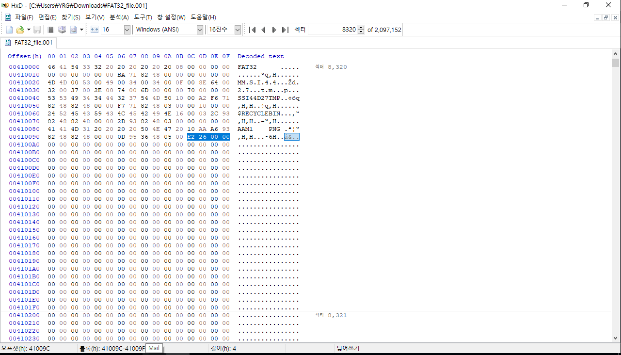 8320 섹터로 이동하게 되면 root인 FAT32를 확인할 수 있다