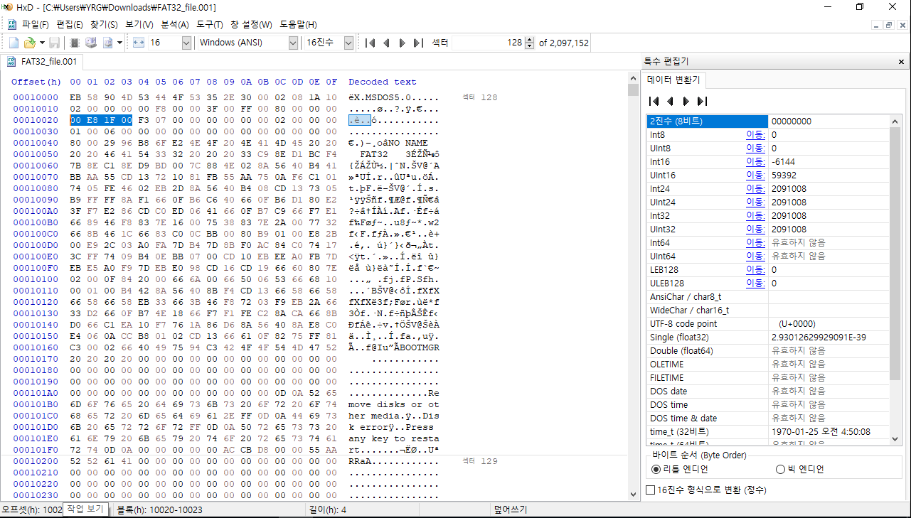 > 총 섹터 갯수: 0x 00 1F E8 00(2091008)