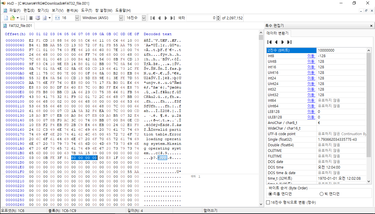 > 파티션 시작 주소: 00 00 00 80 => 128 섹터