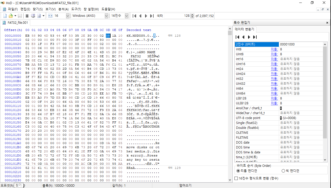현재 헥사 값으로 80인 128 섹터를 섹터 검색 부분에 입력 후 이동하면,