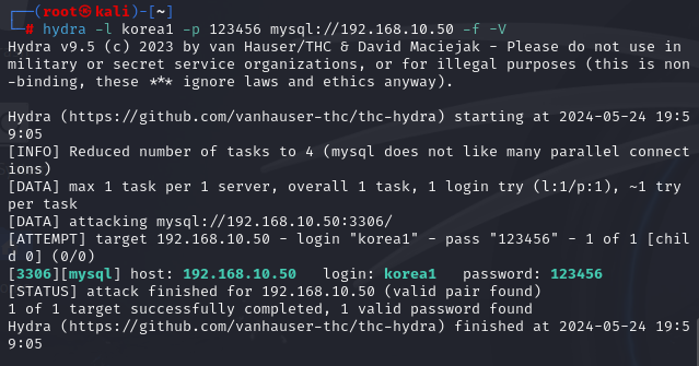 hydra -l korea1 -p 123456 mysql://192.168.10.50 -f -V