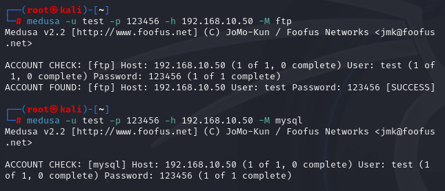 #medusa -u test -p 123456 -h 192.168.10.50 -M ftp