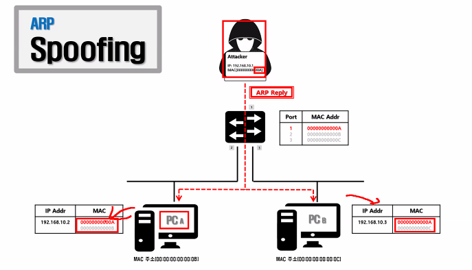 > 공격지의 MAC으로 게이트웨이 MAC 변조