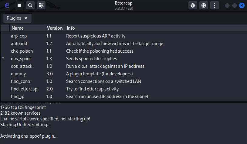 클릭하면 해당 창이 뜨는데 이 중에서 dns_spoof를 더블 클릭하면 옆에 *표가 생기게 된다