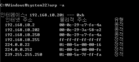 c:\arp -a <-- ARP 테이블 확인