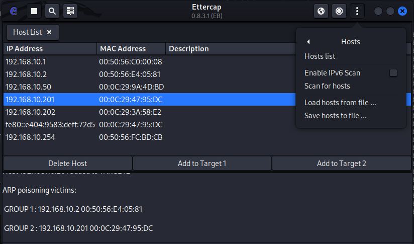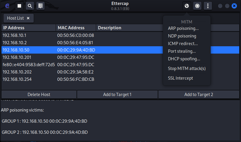 해당 지구 모양을 클릭하여 ARP poisoning 클릭하면 아래 화면에 ARP poisoning victims가 뜬다