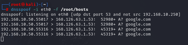 #dnsspoof -i eth0 -f /root/hosts